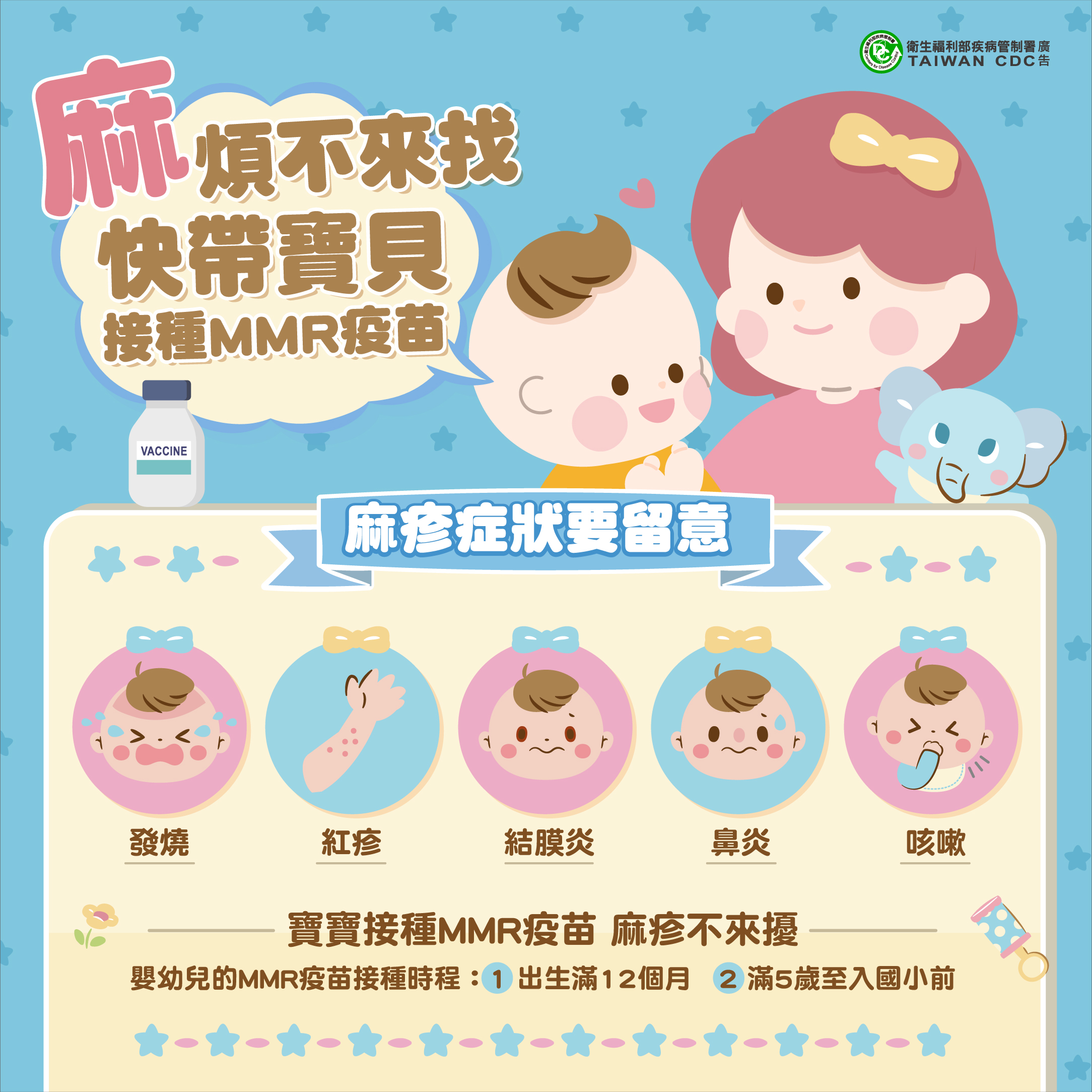 嬰幼兒勿忘接種MMR疫苗 有效預防麻疹 Published 2025-05-11 at 2168 × 2167 in 國內上週新增1例麻疹本土及3例境外移入病例,請前往流行地區民眾提高警覺,返國後如出現疑似症狀,應戴口罩儘速就醫並告知旅遊史