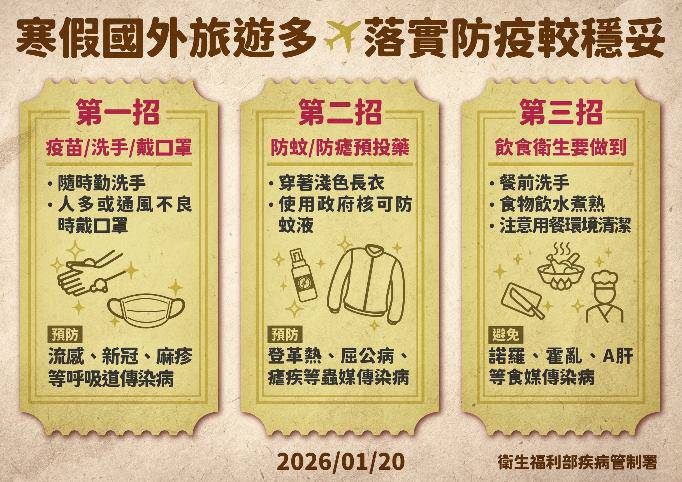 疾管署強調,寒假旅遊放鬆之餘,防疫意識不可鬆懈,無論是在國內活動或海外旅遊,做好基本防護,才能平安過假期。