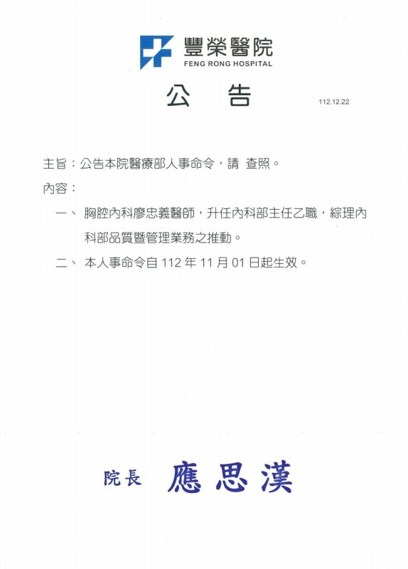 最新訊息 公告本院醫療部人事命令 Posted on 2023-12-222023-12-22 by kyan.liu 新北市政府核定自費醫療項目公告 本院開打~莫德納XBB.1.5、NovvaxB.1.5 疫苗