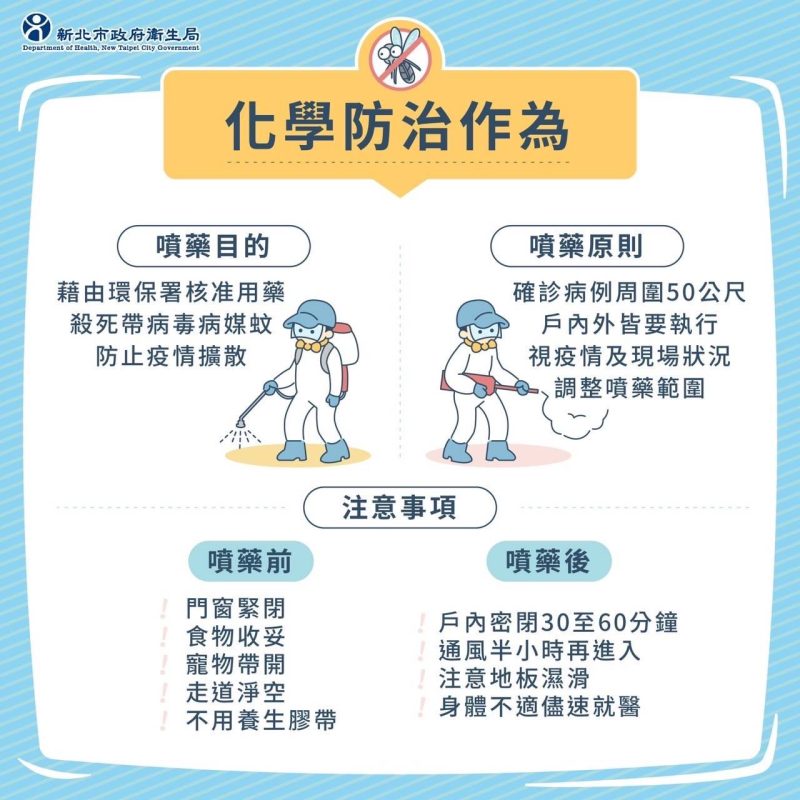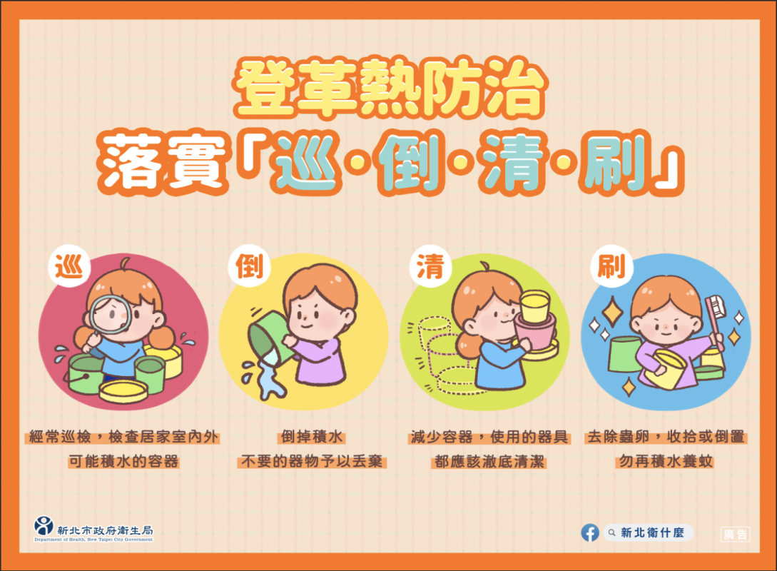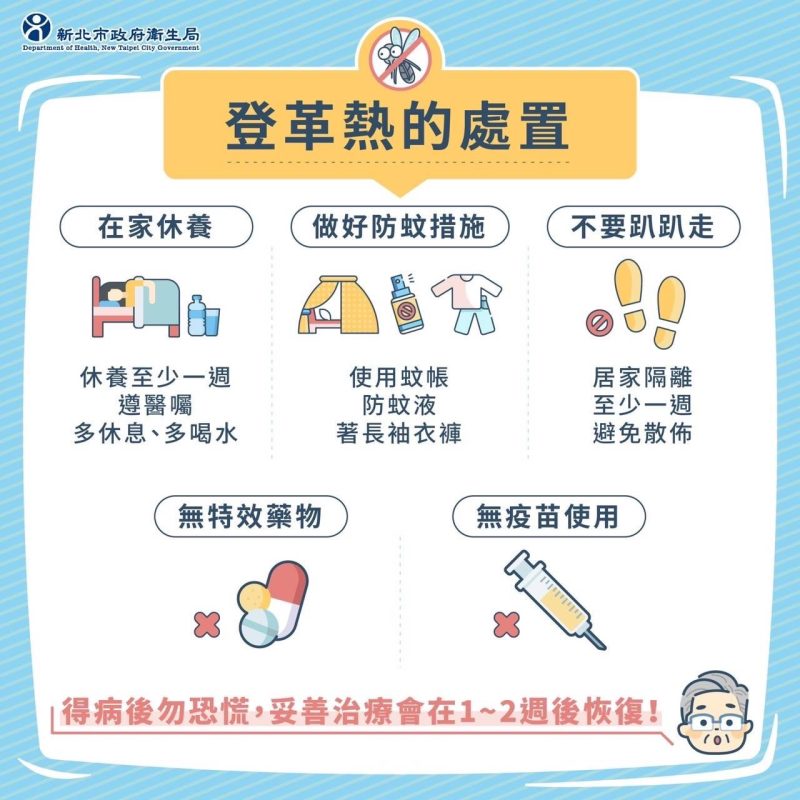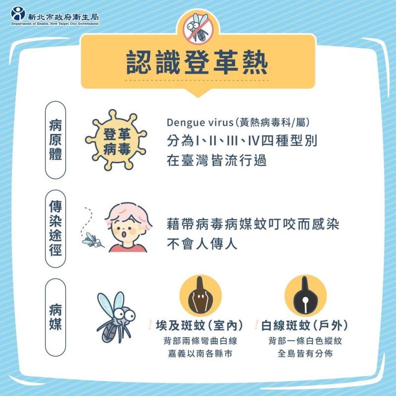 最新訊息, 疫情資訊 蚊子親親,民眾須留新!! Posted on 2024-09-242024-09-24 by 杜 雅萍 本市出現登革熱本土群聚疫情,目前熱區主要在新店區新和里及中和區興南里。請本市醫療機構,每週定期清除機構內外積水容器,避免養蚊,並留意住民身體健康,如出現發燒、頭痛、後眼窩痛、肌肉關節/骨頭痛或出疹等登革熱疑似症狀,請儘速就醫;另外這一波病毒為第二型,症狀較不典型,可能伴隨腹瀉、嘔吐等腸胃道症狀為主。 113年10月1日起施打流感及新冠疫苗 慢箋免費送藥到府